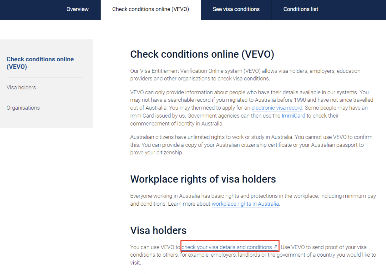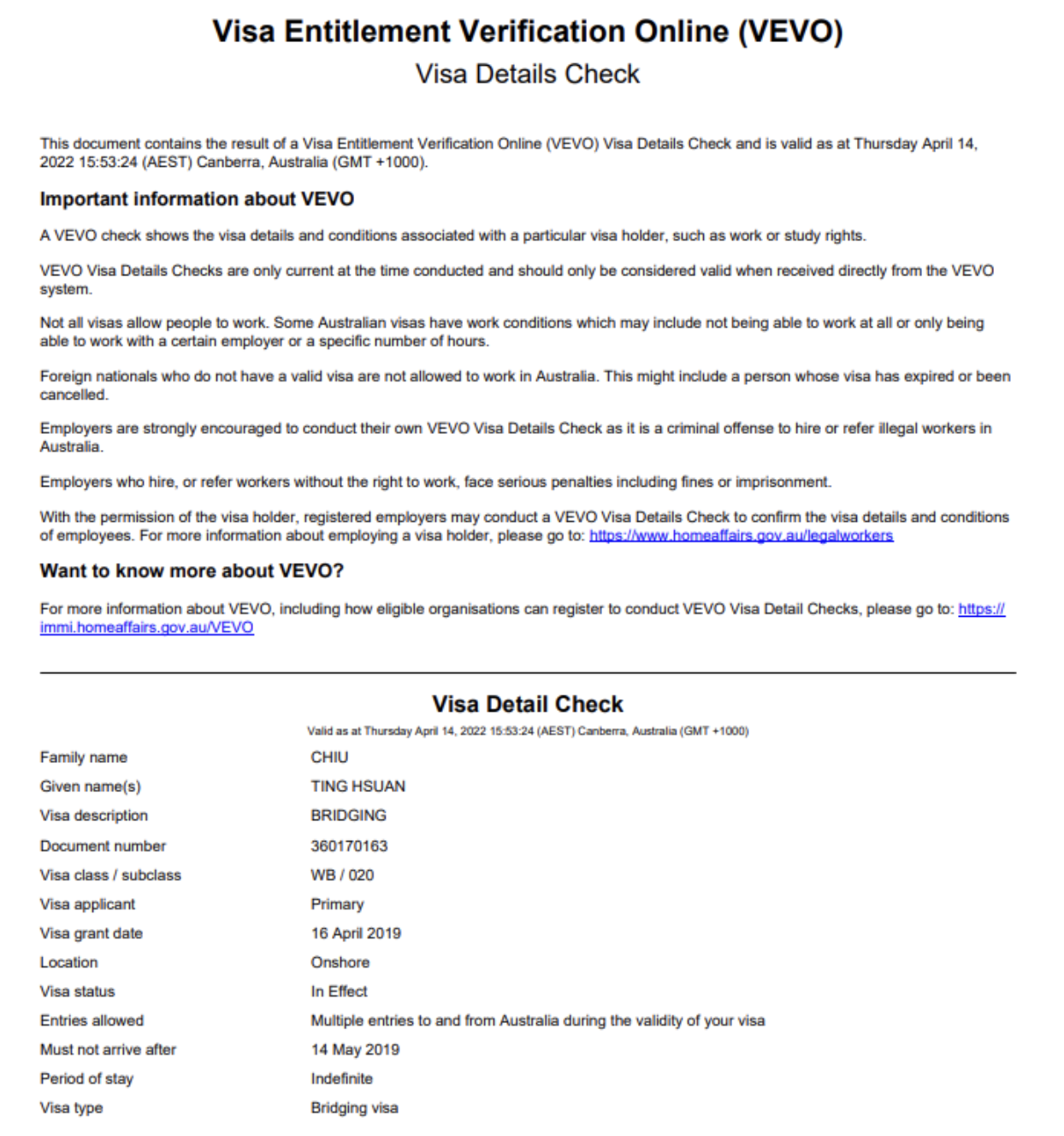 VEVO顯示與特定簽證持有人相關的簽證詳細資訊和條,例如工作或學習權利。VEVO簽證詳細資訊檢查僅在進行時有效,如果僱主需要確認簽證狀態可將此文件發給雇主,往下繼續滑就可以看到簽證狀態的附加條款。