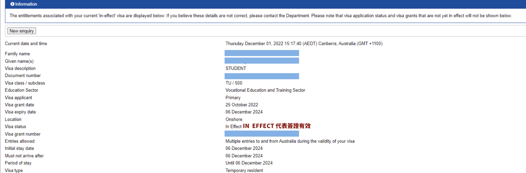 如果您目前尚未獲得實質性簽證或不確定簽證是否有效,可用 VEVO 確認簽證狀態,若 VEVO 無法確認則簽證可能已失效。只要看到是IN EFFECT 就代表簽證有效。